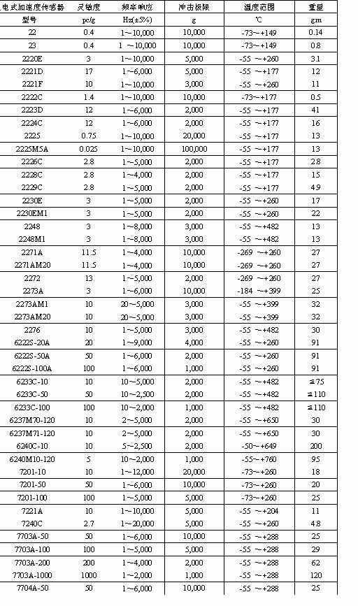 電式加速度傳感器  型號   22   23   2220E   2221D   2221F   2222C   2223D   2224C   2225   2225M5A   2226C   2228C   2229C   2230E   2230EM1   2248   2248M1   2271A   2271AM20   2272   2273A   2273AM1   2273AM20   2276   6222S-20A   6222S-50A   6222S-100A   6233C-10   6233C-50   6233C-100   6237M70-120   6237M71-120   6240C-10   6240M10-120   7201-10   7201-50   7201-100   7221A   7240C   7703A-50   7703A-100   7703A-200   7703A-1000   7704A-50